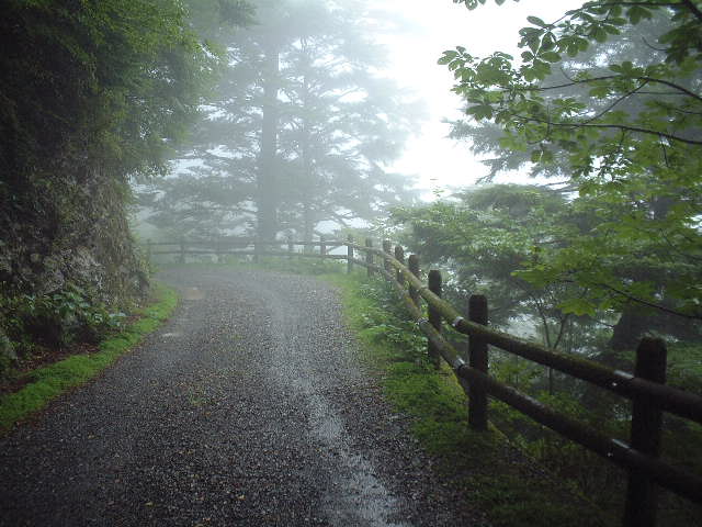 撮影は8月16日。雨か霞かはたまた霧か。山頂に近づくと不意に白い混沌に包まれた。道はガードレールもない断崖を縫うように走る。目の前のもやがなければどのような眺望が広がるのだろうか。駐車場に車を置き、玉置神社への道を静かに歩く。 |