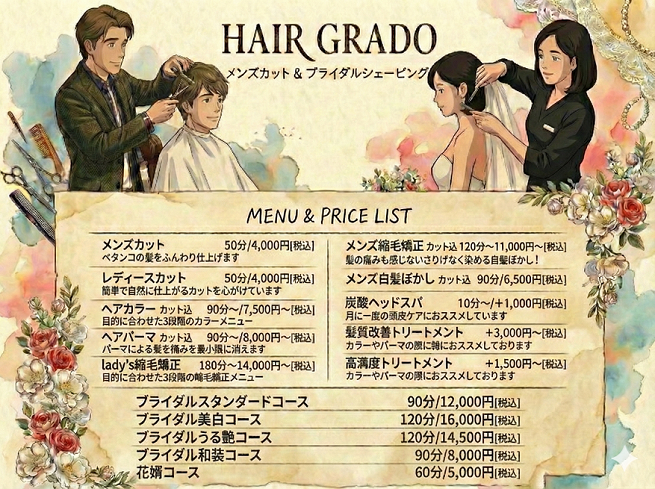 ヘアーグラードが目指しているのは、特別な日だけ利用するサロンではなく、日常の一部として溶け込むような場所です。 「髪が伸びたから行く」のではなく、「今の自分を整えるために行く」。そう気軽に通っていただけるよう、続けやすい価格設定と、大切な時間を奪わない「待ち時間ゼロ(予約優先制)」のおもてなしを大切にしています。世代やお好みに合わせた技術はもちろん、転勤やお引越しで山口市に来られた方にも「ここに来てよかった」と安心していただけるような、温かい接客を心がけています。また、年間200名以上の花嫁様を送り出す「ブライダルシェービング」は、当店の自慢です。女性のお客様には、女性スタッフが個室で丁寧に対応いたします。日常のケアから晴れの日のお支度まで、どうぞヘアーグラードにお任せください。