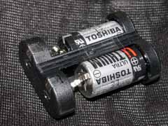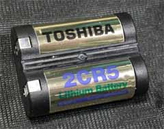 組み合わせたのが、左の写真です。 端子電圧は実測7.3V、 新品の2CR5は実測6.5Vと0.8V高いのが 気になりますが、試しに995に入れてみました。 が、動かない・・・・・ 塩化チオニル・リチウム電池ではデジカメは 動かないようです。うーん、残念・・・ くれぐれも追試しないように(笑) |