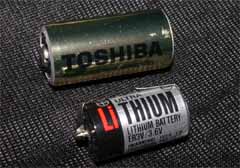 上は2CR5から抜いた電池、 二酸化マンガン・リチウム電池と呼ばれます。 特徴は大電流を取れること、 端子電圧は公称3Vです。 下はジャンクの東芝ウルトラリチウムです。 塩化チオニル・リチウム電池を呼ばれます。 特徴は小電流を長時間取れること、 端子電圧は公称3.6Vです。 |