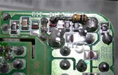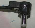 | 純正のACアダプタは高価なので自作しました。出力8.4Vという半端な電圧ですが、秋月の9Vのスイッチング式ACアダプタを改造して8.4Vに変更して使っています。ここまに気にせずとも、9Vままでも使えるとは思いますが・・・ 995のDCジャックは、極性統一の10V以下用のタイプです。ストレート型だと、ケーブルがレンズにかぶってしまって上手くないので、L型の物を買いましたが、995のDCジャックは奥まったところにあってL型のプラグが上手くささりません。そこで、プラグのプラスチック部を削り、ちゃんと刺さるように改造しました。 | 抱かせる抵抗は100KΩ1/6W、 形状が小さいものが良い。 できれば金属被膜が良いが、 ここの抵抗は少々コケても影響が 少ないので、カーボンを使った。 ↓ |
