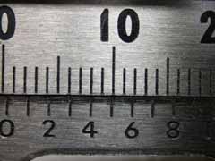 | ズームを広角側にして、2cmまで近寄って撮影したノギスの目盛りの様子です。幅2cmの大きさで撮れます。ちなみに、ズームを望遠側にすると1.5cmになります。これで、写真の保存ドット数は、2048x1536ですから、0.007mmまでの分解能を持つことができます。顕微鏡のようですね・・・ ちなみに、C820Lはマクロレンズを付加して幅が7.5cm、分解能は0.07mmだったようで1桁違います。画面の歪みも桁違い・・・ |