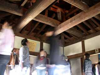 右の写真は、松本城天守閣の天井の様子です。ぶっとい丸太と、寄せ木で作られている構造に惚れて撮ってみましたが、ノンフラッシュでシャッター速度は数秒です。動く物は流れて撮れています。