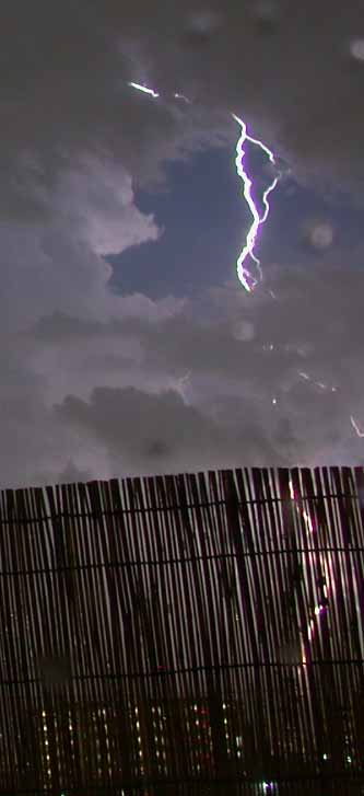 | 2003.9.3 雷を撮ってみました 今日の雷は凄かったです。あちこちで電車も止まったようです。雷のピークも過ぎた頃、ふと思い立ってデジカメで撮ってみました。もちろん、稲光に合わせてシャッターを押しても遅すぎます。そこで、三脚に載せ、マニュアル設定で、シャッタ速度2秒、絞りF3で固定、シャッターを押しまくります。数十枚撮った中で、まともに写ったのは、この1枚だけでした(^^;) もっとも、雷も終わりかけで、空電は多い物の、落雷するものはほとんど無い状況ですので、雷のピーク時なら、この方法でも結構撮れると思います。ちなみに、雨に濡れるのがイヤなので、室内から、ベランダの葦簀越しに撮影しています。おまけに窓の水滴まで写り込んでいます(^^;) こんど、雷が来たら、真面目に撮影してみるるもりです。 |