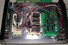 | 一階 左からCPU基板、リレー基板、モデム基板(SK3105です。 CPU基板の左側にはバックライト付きLCDユニットが付いています。 ケース加工が一番大変でした、LCDが顔を出す大型の角穴を開ける のは地獄です。どうしても歪になってしまうし、良い工具が欲しい! |