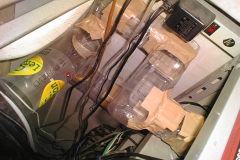 アイディアと言えば、太めのパイプにペットボトルを使ったことです。底と先の細くなった部分をカッターで切り落とし、ガムテープで繋いで行くだけです。僅か1mくらい引き回すだけで7本もの容器が必要になります。また、送風ファンとペットボトルを繋ぐ部分と、パソコンの排気を拾う部分にはティッシュペーパーの箱を使っています。廃物利用で、ゴミさえ有れば1円も費用はかかりません