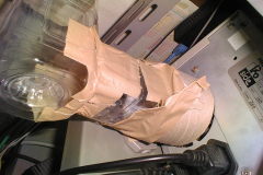 | パソコンの裏の吸い取り口も改善してみました。茶色い部分はドア隙間ふさぎ用スポンジで、これに押しつけておけばエア漏れが少なくなる寸法です。でも、押しつけなくても結構吸ってくれるようで、1〜2cm離して置く方が、効果的だったりします。(きっと、空気の整流効果が悪いのでしょう) |