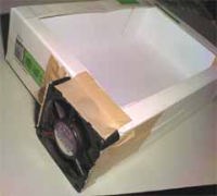 | 上の写真は、新型CRT排気システムです。無用になったペンタPRO用のCPUファンを紙箱に取り付けて、CRTの上に被せて排気します。CRT全体を覆うより、簡単ですがエア漏れが少ないので効果は高そうです。これは、消音化のため5Vで駆動します。 | |