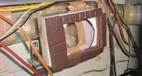 右側の段ボール箱はCRTの熱を受ける部分で、白い紙製のダクトで熱気を導く