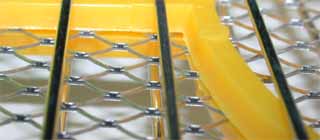 | ラケットの放電面の様子、 上下の針金と、真ん中のメッシュの間に高圧が掛かります。 誤って触れてしまい、感電したら結構痛かったです(笑) 金属部が綺麗なうちは、結構効果がありそうです。 |