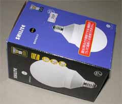 | 最初に登場した300円の電球型蛍光灯から、何種類からのモデルが発売されたけど、どうも興味をそそられるものは無かった。そんななか、最初の300円のモデルは完売し、新型が350円となって登場した。最大の特徴は、丸いカバー付きであること、そして90W相当と少し明るくなったこと。50円高くなったが、壊れにくく明るくなったのは評価できるので、早速買ってみた。 丸いカバーは、かなりしっかりしている。これで、ガラス管が割れたりするトラブルは少なくなったと思われる。反面デメリットもある、カバーが付いた故に暗くなってしまうこと、ただ、それをカバーするためか消費電力が20Wと多くなり、90W相当品となっている。もう1つのデメリットが、大きすぎて照明器具に入らないこと(^^;) 以前購入した300円モデルは、トイレで使用中だが、暗くて気に入らなかったので交換しようと思っていたのに、照明器具の中に入らず、仕方がないので玄関用に使ってみた。 |