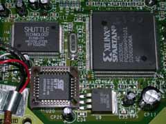 左上はUSBコントローラ、下がROM(27SF512)、 右がXILINXのスパルタン(XCS30XL) |