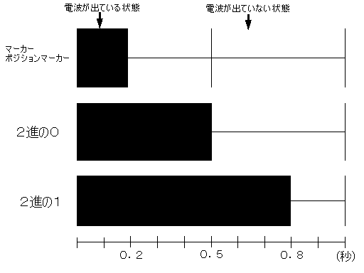 JJYの標準電波のタイムコードは、(右下の図)のような3種類の信号に分けられます。「TCO」のLEDは、この図のように1秒間隔で点滅していれば、正しく電波を受信している可能性が高いと言うことになります。うまく受信できていない場合は、LEDが全く点灯しなかったり、逆に点灯したままだったり、また、不規則にチラチラと短い間隔で点滅したりします。少し慣れれば、今、ちゃんと受信できているかどうか、一目で判別できるようになります。