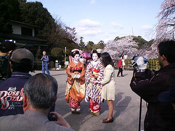 しだれ桜の前でテレビの生中継をやってました