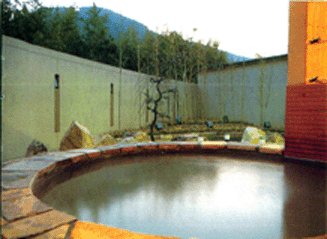 露天風呂には石庭が設けられているが 簡素すぎて昼間は NG。しかし、冬期照 明が入るとぐっとムードアップ 。立ち 上る湯煙が幻想的な雰囲気を醸し出す。 |