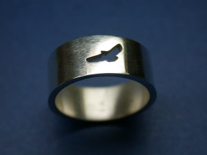 鷲が飛んでいるイメージのシルエットを抜いた リングを作ってみました。 やはり鳥ものはどんどん作ってみたいです。 これは自分でもとても気に入りました。 しばらくこのタイプでいろいろとバリエーションを 作ってみようと思っています。
