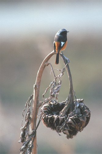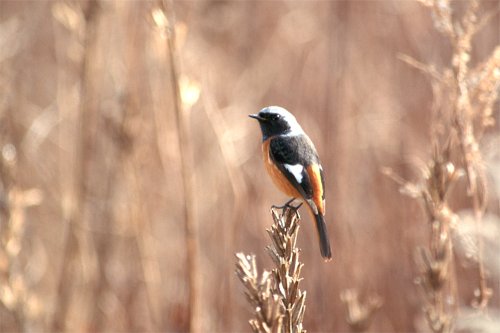 ジョウビタキは後ろ美人だ。 冬鳥で11月頃になるとやって来る鳥で、比較的身近にもいる。 家の庭にもよくやってきて愛想を振り撒いてくれる。 ヒッ、ヒッ、ヒッ、とアンテナの上などでよく鳴いている。 皆さんも少し気をつけてみて見ると意外と身近にスズメ、ツバメ カラス、ハト以外の知らない鳥がいることに気がつくはずです。
