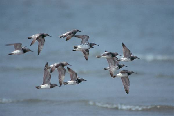 1997/4/20 オバシギ 海岸でシギチを見るには引き潮から汐が満ちてくるときが良い。 なぜなら汐が満ちてくるのにあわせてシギチがだんだん近づいてくるからだ。 そのクライマックスが最後の飛び立ちで群れで飛翔してくれるときはとても美しい。 これが撮影の一番のねらいでもある。