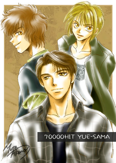 大変遅くなりましたが、(って一年だよ、オイ!) 70000HITのキリリクゲッターyueさまへのイラストですvv リクは「尚也、子規、クリスの3ショット」ということで、 3人のイラストです。ちょっと秋を意識してこんなかんじの色合いで(^ヮ^) ご満足いただけたでしょうか?すいません、1年もお待たせするほどの出来では ないですよね…。とほほ(−ヮ−;)