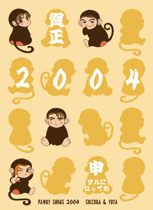<2004年年賀トップイラスト・忍、珠ちゃん、ヨッさん and カナメ(大人になっても)>