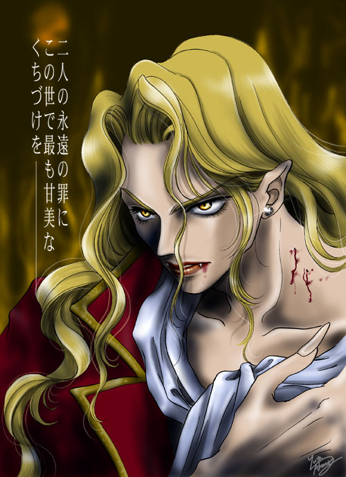 「クロノクロス」攻略のお礼にろぐなさんのところに差し上げたイラスト。 これは彼女のオリジナルキャラでヴァンパイアの「フィラヴィオ」です。 やっぱヴァンパイアってかっこいいなあっvv しかしシチュエーションが謎になってしまった。 血を吸ったのか吸われたのか・・・?(苦笑)(ゆた)