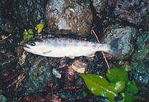 | 養鱒場下の小さなプールで釣れた30センチのニジマス。かなりの引きに思わず腰をためて勝負してしまった。かなり左右に走り回り、久しぶりの手応えにしびれてしまった。 | ![]() |