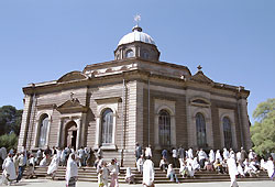 シバの女王とソロモン王の子メネリク1世がイスラエルから持ち帰ったアーク(モーゼの十戒を納めた「契約の箱」)が納められているので有名な教会です。アフリカで一番古い教会で、4世紀にエザナ王が建設しましたが9世紀に女王グウディートが破壊しました。その後16世紀にファシリダス帝が女人禁制の旧シオン・マリア聖堂を建設し、20世紀にハイレセラシェ皇帝が男女が入れる新シオン・マリア聖堂を建設しました。新聖堂では1000年前にヤギの皮に描かれたという色鮮やかな本を見せてもらいました。
