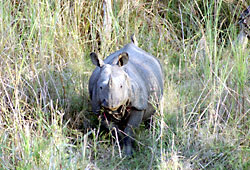 ポカラからバスで約6時間でチトワン国立公園に到着。途中、川の中をジープで流されるように走ったりしてネイチャリング気分も高まりました。象に乗って移動するエレファントサファリでは、エレファントグラスという丈が2〜3mもある草地を分け入って進みます。すると、いきなりサイが登場。野生動物の宝庫をいわれるチトワン国立公園だから、次は何かでるのかと期待しましたが、結局見られたのはこれだけでした。