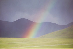 18時36分、ナクチュ(4,513m)に停車。はじめてホームに下りることができましたが、写真を撮る暇もなくすぐに車内に戻されてしまいました。発車後まもなく黒い雲がたちこめ雨が降り出した様子。でもこれが幸いし綺麗な虹を見ることが出来ました。20時33分、ダムションを過ぎるとニンチェンタングラ山脈の山々に夕陽が当たって赤く染まっていました。
