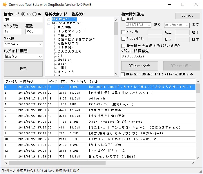 例えば、ダウンロード数が多い奴だけを落としたいとか、ページ数が多い奴だけとか選べます