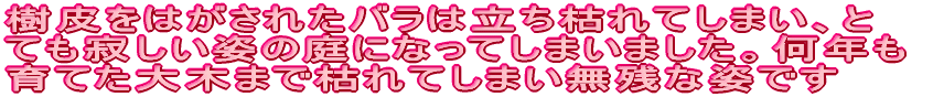 樹皮をはがされたバラは立ち枯れてしまい、とても寂しい姿の庭になってしまいました。何年も育てた大木まで枯れてしまい無残姿です