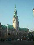 町中にある電光温度計を見ると摂氏1度。内陸のハノーファーよりも3〜4度は低い気温だ。その代わりに空は青々と澄み渡っている。放射冷却ってやつだな。でも寒いことにかわりはない。こんなとき、大事な用件はサッサと済ませておくに限る。大事な用件・・・・って、何だったっけ? あ、そうそう。新しく出来てるはずのパスポートを取りに行くんだった・・・(冷汗) というわけで我々3人はまず市庁舎にやって来た。見よ、この青空! 1月に来たときはどんより曇り空がバックだったというのに、この違いと来たら! 立派な市庁舎の迫力がさらに倍増。もうこれを見ただけで気分がウキウキしてきた3人。