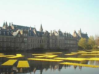 デン ハーグ 〜 Den Haag 〜 前日、ホテルに着いて、お風呂に入って、サッカー(U−20W杯の決勝)を見るなり、速攻で眠りについたひろちゃん&よしこ。初めての4つ星ホテルですごく快適な夜をすごせた。完全熟睡。おかげでメチャ早起きの寝覚めスッキリ。あさ5時くらいからまたお風呂に入って、疲れもとれて、準備万端。窓の外のお洒落なショッピング街はまだ閉まったまま。 旧市街にある聖ヤコブ教会。さすがに朝の7時。だれーもいない。晴れた〜! 青空だぁ〜〜! ハウステンボスの「ホテルデンハーグ」のモデル、ビネンホフ。13世紀から17世紀に建てられた由緒ある建物が集まっている。ホフフェイファの池には黄色い植物が浮いていて、その上にお母さんカモと生まれて間もない赤ちゃんカモたちを見つけた。とてもいい風景。ここを見れただけでもデン ハーグに来た価値があった。う〜〜ん、素晴らしい。 左はビネンホフの一角にある「オランダで最も美しい建物のの一つ」といわれる王立マウリッツハイス美術館。ここにはレブラント、フェルメールといった有名な絵画があるそうだ。「ここには、とてもすばらしいオランダの絵があるんだぞ!」と通りすがりのおじさんが自慢げに話してくれた。 右はビネンホフ内にある「騎士の館」と呼ばれる13世紀の国会議事堂。