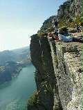 だんだん道が険しくなり、本格的な登山みたくなってきた。左の写真、実は道を間違えて別の場所へ出そうになったところ。この登山道は多くの観光客が目的地の断崖絶壁・プレーケストーレンまで歩いているんだけど、ほとんどが所詮は初めてくる観光客。誰かが誤った方向へ行くと、後ろのみんながそっちへついて行っちゃうのよね(哀)。「こっから先は行き止まりだぞ〜!」と先頭から声が聞こえてきたので、みんな来た道を逆戻り。タハハ。
