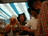 昼の2時をまわった頃には、かなりみんなハイになってます。変な指の立て方をしたアジア人カップルもいました(左の写真)。もう、乾杯の輪はテーブル内に留まらず、隣のテーブルへと飛び火。みんな、こちらがアジア人と見るや、珍しがって喜んでくれるのが、得なのか、何なのか・・・ ま、楽しいからヨシとしよう。