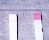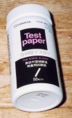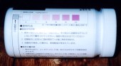 試験紙を一秒漬け、引き上げて一分後に標準比色表と比較します。