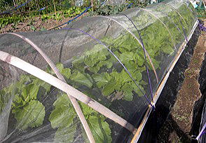 11月4日 : 上の写真は白菜、下はキャベツで生育は順調である。 特に白菜の第一回定植分はネットいっぱいとなっている。 しかし、先日ゼンターリを散布したにもかかわらず虫の被害は収まらないようである。 露地物はほとんど毎日葉裏の紋白蝶やガの卵、小さなアオムシ、アブラムシ等を指で払い落したり、つぶしている。 ネット内も虫食いの穴があればチェックしているが、卵は見つからないが、小さい青虫は何匹か捕まえている。 |