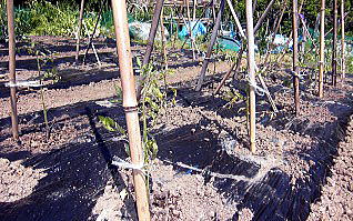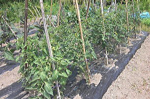 4月27日 : キャロル、フルティカ、アロイの苗はすでに第一花房第一花は咲いてしまい、茎は大分徒長し、下葉が一部黄色く枯れてしまった。 病気か生理障害か不明。 とにかく、ここのところの冷え込みもやっと無くなり、遅霜の心配もないようなので圃場に定植。 畝はキャベツ、白菜跡に剪定堆肥と米糠を散布し、耕した所で、特に元肥は入れていない。 畝幅120cm、黒マルチを掛け、2条植えの株間60cmとした。 |