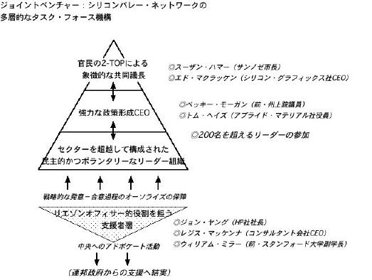 これに対して、90年代のシリコンバレーは、伝統的なスタンフォード大学近辺のハイテク集積地域だけではなく、周辺の広大な経済波及地域も含めた広域圏として、新たな政府(NPO)主導システムでの地域再生プロジェクトに望むことになる。シリコンバレーの歴史は、ベンチャー企業、ハイテク企業のスタープレイヤーたちの華やかな活躍ばかりではない。地域のリエゾン機能不全、対立、不信、罵り合いといった、多元主義の弊害が噴出するなかで、地域の危機に立ち向かう運動のなかから生まれたのが、ジョイントベンチャー・シリコンバレーネットワーク(JV-SVN)という「産官学民連合政府(NPO)」である。