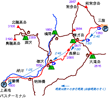 | ルート | 三股〜蝶ガ岳 | 蝶ガ岳〜徳沢〜河童橋 |