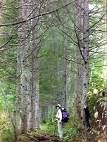 その後しばらく登ると,割に平らな所に出て,最初は美しい林の中(写真左)をほ とんど直線で歩き,その後は湿原になる.湿原を過ぎてまた登りになるが少し登 ると水場があり,視界が開ける.ここでは正面に,雲の合間に時々常念岳が見え た.12:25〜13:05,ここで持参したパンで昼食.この水場付近では下山してくる ほとんどの登山者が休憩していった.小雨がふり始めたがすぐに止んでひと安心.