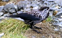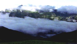 テント場の周辺はハイマツが多く,ホシガラスが実をくちばしで割っては食べて いた(写真上).2m位まで近づいても逃げようとしなかった.天候はそう悪くない のだが穂高,槍ヶ岳方面は殆ど雲に隠れ,常念岳だけが見え隠れしている程度で, 夕飯の支度をしながら時々見ていると,たまに槍ヶ岳のさきっぽが雲の上につき 出ていた.夜は風が殆どなく,こんな静かな夜は久しぶりだった.のに,なぜか 殆ど眠れず.