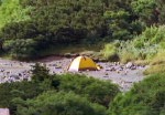 ここからは,もうほんの少しの登りで,15:15に標高2677mの蝶ガ岳ヒュッテ(電 話 0263-58-2210,250人収容,6/20〜10/20)に到着.なんとここには,ジョッキ の生ビールがあった.この夏一番のおいしい生ビールとなる.ここはラーメンも 大変美味しかった.ヒュッテから50m位のところにあるテント場にテントを張っ たが,日曜日の午後ということもあり,我々以外のテントは1張りだけであった. ヒュッテのほうも,そう混雑していないようであった.