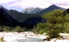 13:25 徳沢着.徳沢園で昼食をとり(ここの野沢菜ピラフはおいしい!量もたっ ぷり.) ,14:15河童橋を目指し一般道を上高地の風景を楽しみながら歩く.写 真下は徳沢から10分ほど上高地方面へ歩いた場所からの風景.15:40 河童橋着. バスターミナルで松本までの通しで切符を買い時間までお土産屋さんで時間をつ ぶす.バスは,前夜の寝不足からか殆ど熟睡していた.