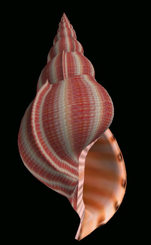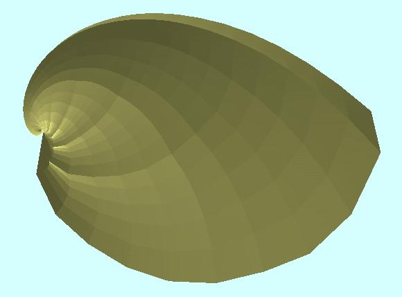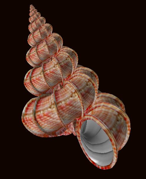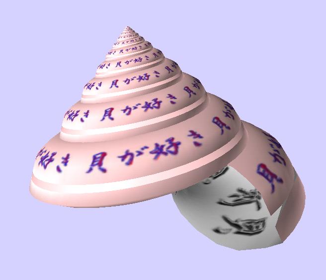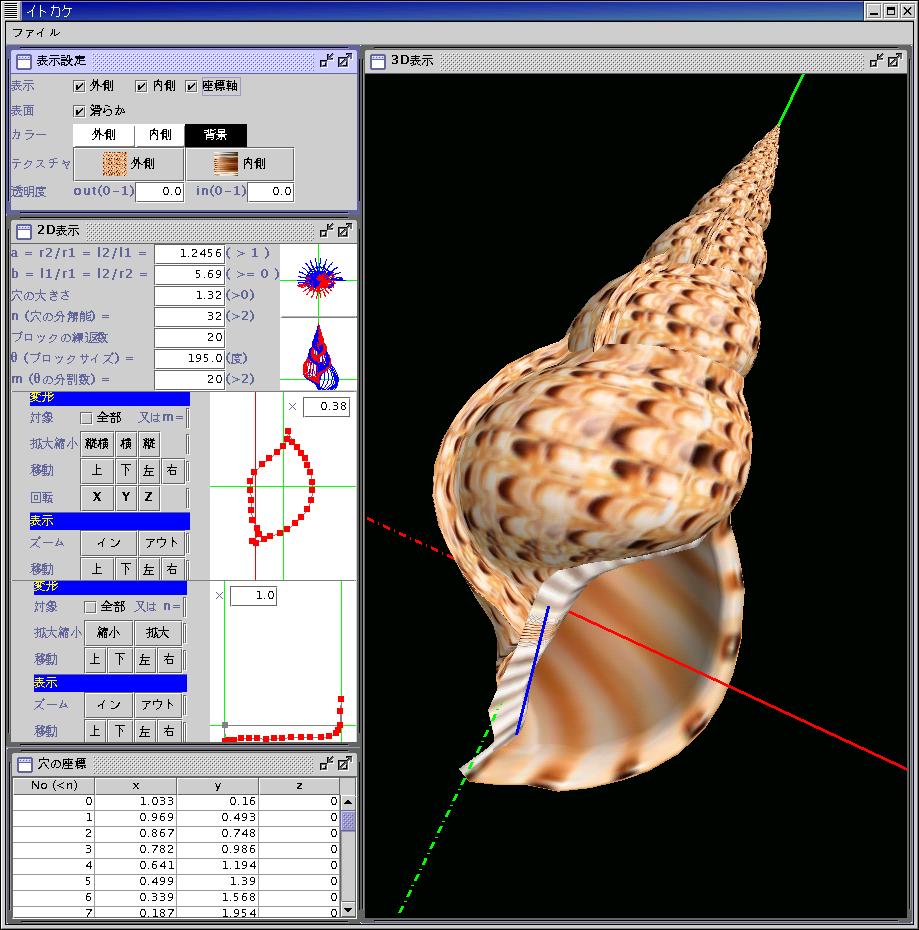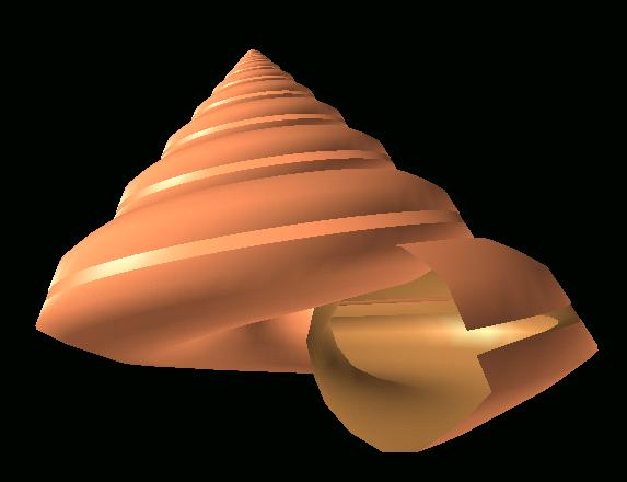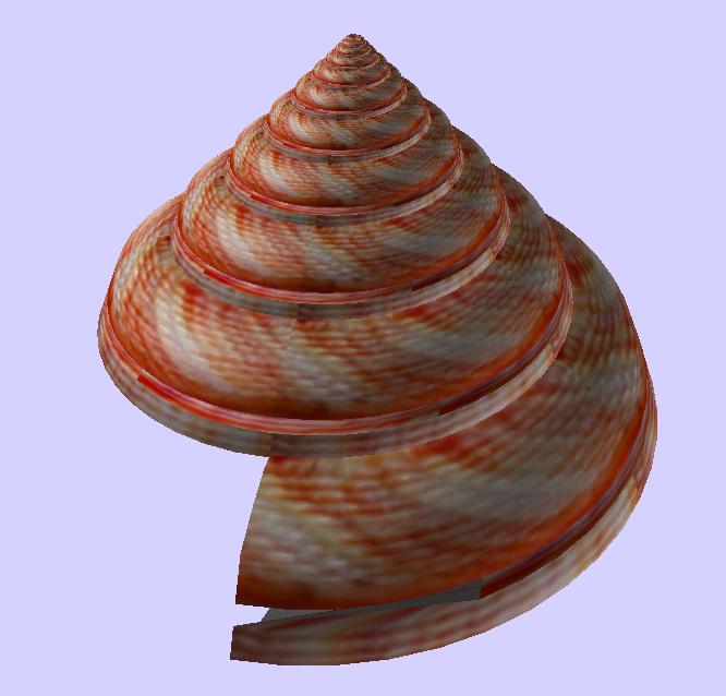口の図形が、巻きの中心Oにたいしてθ回転成長する間に、Oからの距離が、 a = r1 / r0 = l1 / l0 の比率で増える。また、殻の底辺の長さに対する殻高の比 b = l0 / r0 = l1/r1が一定 という条件。実際には、成長と反対の順で描画している。また、平面のスムー ジング処理はしていないが、法線ベクトルを周囲4点の平均を用いることでそ れらしくしている。なんだか、とっても簡単なことを難しく言っているよう な気がする... |