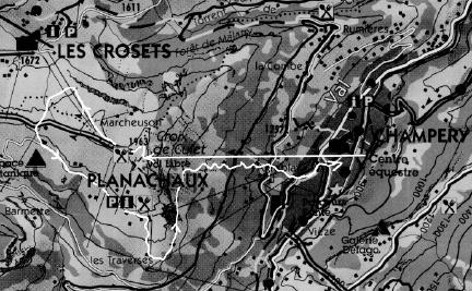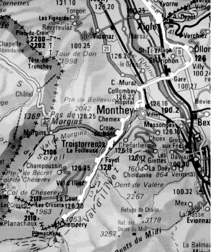 歩き方によるとPlanachauxからDents de Midiとそれに続くDents BlanchesをみながらのハイキングコースがあるはずであるがInformationで調べる予定であったが, 寄らなかったので適当に表示板を見ながら歩いて,Champ屍yに下りてからInfo.でハイキングマップを買ってコースを調べた.