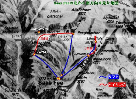 - まず,Langflueのレストランで腹ごしらえをして,氷河の上をすこし登ってみた.Domの方へ登ったと思われるフル装備の登山者達が丁度氷河の上を戻ってくるのが見えた.ここはFee氷河のど真ん中に位置して,ここからは,Allelinhorn(4027m)がMittel Allalin(3456m)の展望台越しに良く見えた.また,主峰Dom(4545m)を中心とするMischabel連山が間近に見えるが,この時は,Domの頂上に雲がかかっており,そこだけ見えなかった.