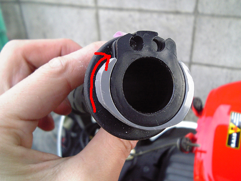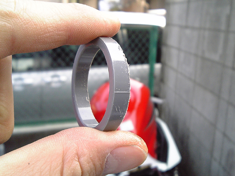 まず塩ビパイプを切り出します。この塩ビパイプの内径は、スロットルスリーブの外径と同じ径のモノを選びます。 塩ビパイプの削り出す幅は、スロットルスリーブのワイヤーが掛かる部位と同じ幅になります。 ![]() こんな塩ビパイプを買ってきます。 近所のホームセンターで50円でした。(切削後に撮ったので削りカスが写ってますが・・・) ![]() こんな感じに輪切りに切り出します ワイヤーのタイコ部分が引っ掛かる部分と干渉する個所をニッパー等で切ります。 つまり「C]みたいな形になります。 ここで現物合わせでスロットルにはめ込み、タイコ部分と干渉しないか確認します。 また「C」部位の2箇所の先端はワイヤーが当たりますので、斜めにカットしヤスリで仕上げます。 この工程を怠るとワイヤーが切れる危険性がありますので、出来る限り滑らかに仕上げます。 ある程度仕上がったらスロットルにはめ込んで動作確認をします。 恐らくスイッチ側のボディと干渉する部分が出てくるので、干渉する部分を削り込みます。 基本的にハイスロというものは、スロットルを捻った時により多くのワイヤーを巻き取る事が目的ですので、ワイヤーが掛かる部分はなるべく削らないようにします。 自分の場合は、それを念頭に削った結果、下図のような形になりました。 ![]() かなり歪な形ですがこれがベストです。 ![]() 赤線の部分をワイヤーが通りますので、なるべく削らないよう厚みを残します 実際にスロットルにハメるとこんな感じです。 あとはキレイに組み込んでスロットルの回り具合が重くないかを確認します。 スロットルの回り具合が重い場合は、さらに干渉部分を削りこみます。 仕上げにスロットルと塩ビパイプの削り出し部位を両面テープで接着して完成です この自作ハイスロで、YZF-R1のスロットルよりアクセル開度が少なくなりました。 |