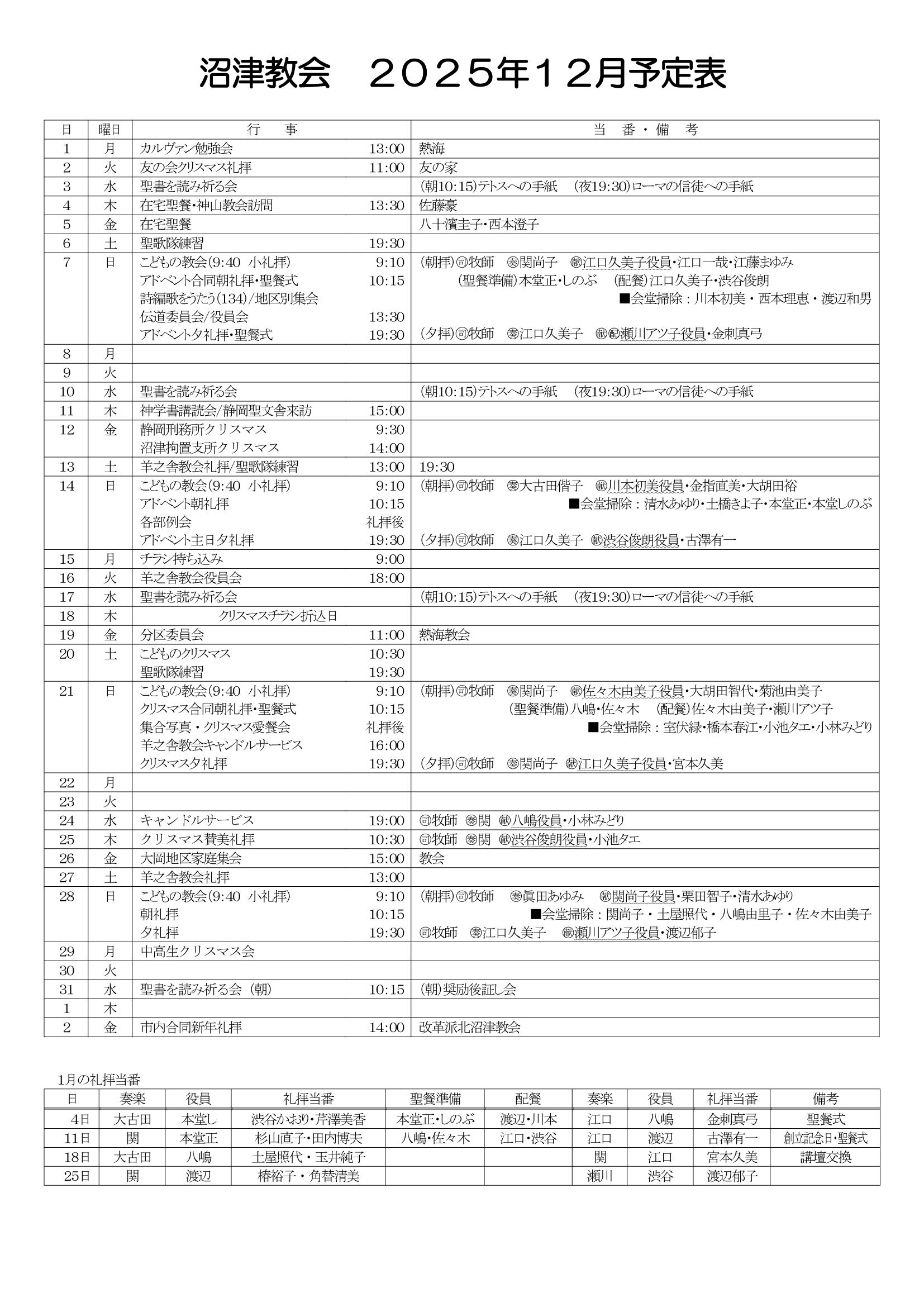 ■ クリスマス礼拝(降誕日) ■ クリスマスキャンドルサービス 12月24日 ■ イースター礼拝(復活日) ■ ペンテコステ礼拝(聖霊降臨日) ■ 沼津教会創立記念礼拝 1月 ■ 伝道礼拝 毎月第3主日(日曜日)
