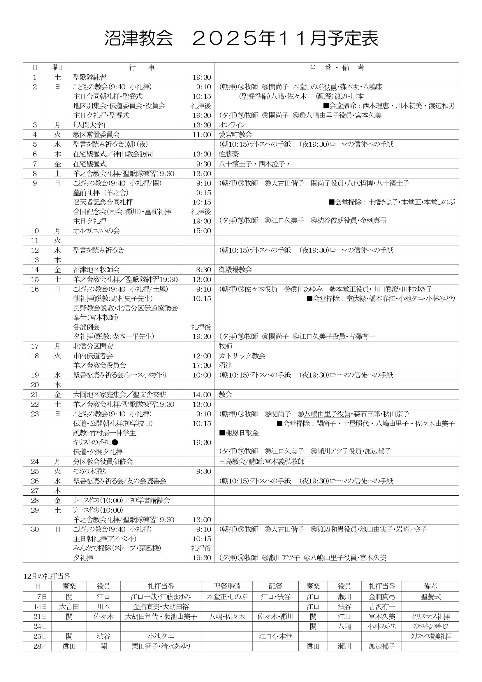 ■ クリスマス礼拝(降誕日) ■ クリスマスキャンドルサービス 12月24日 ■ イースター礼拝(復活日) ■ ペンテコステ礼拝(聖霊降臨日) ■ 沼津教会創立記念礼拝 1月 ■ 伝道礼拝 毎月第3主日(日曜日)
